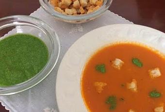 - Acompaño la sopa con la salsa de albahaca y los trocitos de pan tostado y cada uno se añade