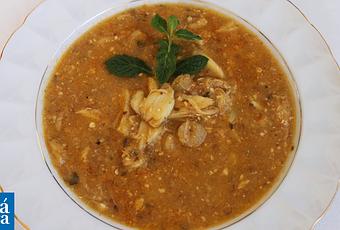 En el mismo aceite sofreír la cebolla picada, añadir el tomate y seguir sofriendo. Agregar el pimentón, retirar del fuego y triturar esto junto con las almendras, ajos, rebanadas de pan, perejil y vino.