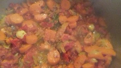 Pela y corta las zanahorias en rodajas, añádelas al sofrito. Remueve un poco.