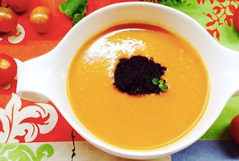 Me vais a permitir presentar una deliciosa sopa de tomate con crujiente de morcilla.