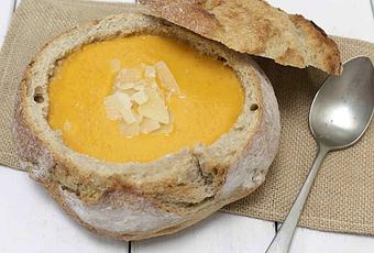 SOPA DE TOMATE SERVIDA EN CUENCO DE PAN