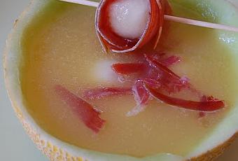 Os pongo lo que necesitamos y cómo se hace.Ingredientes:1 melón redondo y madurito.Zumo de una naranja.Zumo de 1/2 limón.50 ml. de vino blanco.1 cucharada de miel.Jamón en lonchas.Preparación: