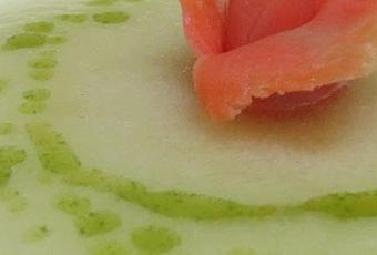 - Vertemos la sopa fría de melón y terminamos con una cucharada de aceite de hierbabuena y listo para comer.