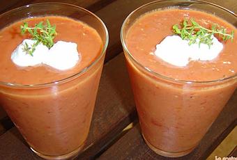 Pelar los tomates, trocearlos y ponerlos en el vaso de la thermomix. Añadir el resto de ingredientes y triturar hasta conseguir una sopa de textura bien fina.Apartar en un bol y meter al frigorífico hasta que se ponga a una temperatura fresquita.
