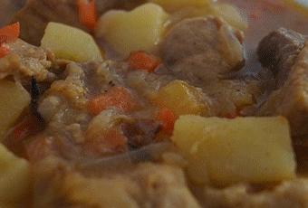 Cuando la carne esté lista, apartamos en una fuente. En la misma cazuela, salteamos la cebolla picada en juliana fina, a fuego moderado, hasta que queden tiernas. Añadimos los tomates pelados y en trozos y el caldo o agua.Añadimos la carne junto con el pimentón dulce y picante y el pimiento rojo cortado en dados. Dejamos que comience a cocer y tapamos, dejamos a fuego lento durante dos horas. Pasado este tiempo añadimos la patatas cortadas a dados y dejamos media hora más.