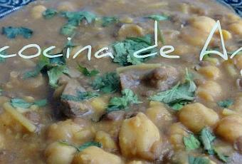- La noche anterior, poner a remojo en agua caliente con sal 1 taza de garbanzos. Escurrir, enguagar y poner en la olla exprés junto con ½ taza de lentejas, ½ kg. de carne de ternera o cordero troceada, ½ cebolla picada, 4 tomates pelados y picados, 1 ramita de apio entera o picada, 1 cdta. de jengibre molido, una pizca de azafrán, 1 cuch. de smen (mantequilla clarificada de leche de oveja), sal y pimienta. Cubrir con agua, cerrar la olla y dejar cocer 35 minutos.