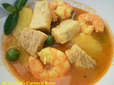 ¿Cómo la preparo? Ingredientes para dos personas: Trozos de pez espada, langostinos (la cantidad de langostinos y pez espada al gusto del consumidor), un “puñaito” de chicharos (guisantes frescos a ser posible), una patata mediana, media cebolla, tres dientes de ajo, un tomate triturado (sin piel ni pepitas), medio vaso de aceite de oliva virgen extra (en ésta ocasión de Periana, malagueño), sal, agua, un sobre de colorante alimentario (una carterilla del Aeroplano), una ramita de hojas de perejil y otra de hierbabuena. Los pasos a seguir: Pelar los langostinos y reservar la carne. En una cacerolita echar el aceite y pochar a fuego lento la cebolla y los ajos cortados en trozos pequeños, junto con las cabezas y la piel de los langostinos; cuando estén dorados (cuidado de que no se quemen) agregar el tomate junto con el perejil y dejar freir todo el conjunto. Pasar el refrito con un poco de agua por la minipimer. En la misma cacerolita echar agua y añadir el refrito pasado por un colador fino. Añadir las patatas cortada en rodajas y los guisantes dejándolos cocer durante unos quince minutos o hasta que la patata esté tierna. En ése momento incorporar los langostinos y los trozos de pez espada, dándoles un hervor de unos cinco minutos más o menos. Apartar del fuego y servir muy caliente, sin olvidar su ramita de hierbabuena.