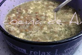 Sigo con mi recopilación de platos gaditanos, en este caso una sopa muy antigua. En mi casa, el huevo batido en los caldos no nos gusta mucho, pero os la he hecho como es la receta tradicional. Espero que os guste y os deseo un feliz fin de semana!- En una cacerola, derretir 3 cuch. de manteca blanca y dorar 1 cebolla picada y 100 grs. de carne picada; salpimentar. Rehogar y añadir 100 grs. de lentejas (puestas en remojo desde la noche anterior), perejil picado, azafrán y cubrir con 2 litros de agua.