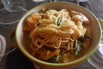 - Añade el resto de pescado ya troceado y los noodles, deja cocer 4-6min y desenvuelve los fideos con ayuda de un tenedor
