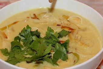 Receta de sopa thai, con pollo, fideos de arroz, curry y leche de coco.