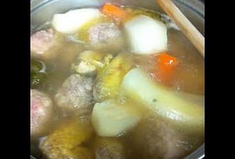 En una olla ponemos agua y todas las verduras lavadas y cortadas , las alitas de pollo y un pimiento verde .