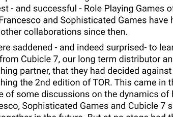 Pues el caso es que, gracias a Migue de Rol+ nos enteramos que Sophisticated Games, al parecer desde su cuenta oficial en Twitter, puso el comunicado que veis arriba, diciendo que esto les ha sorprendido y que poco menos que la culpa es de Cubicle 7 por romper la baraja debido a desavenencias en como ellos,Sophisticated Games y Francesco Nepitello (Creador del juego) debían colaborar.