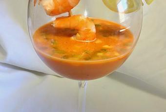Emplatamos en una copa añadiendo al gusto el pimiento y la cebolla picada, presentando con una brocheta de gambas y una rodaja de limón.