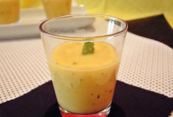 PREPARACIÓN:Cortamos las frutas en dados y lo metemos en una batidora de vaso junto con el yogur, el azúcar invertido (puede ser azúcar normal o si el melocotón es en almibar ese mismo caldo) y las hojas de hierbabuena picadas.Nos ponemos a batir hasta que se haga un puré, lo metemos en un recipiente apto para congelador y lo dejamos un par de horas, lo sacamos y removemos para que no se haga un bloque congelado. Se saca, ponemos en una manga y servimos en los vasos donde se va a tomar.