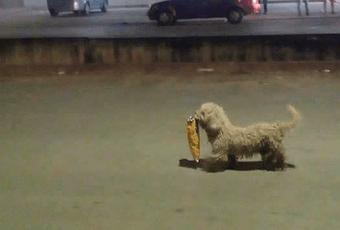 En la fotografía se logra apreciar como el perrito carga un pollo en su hocico luego de que se presentaran diversos saqueos en los supermercados de Chetumal, Quintana Roo.