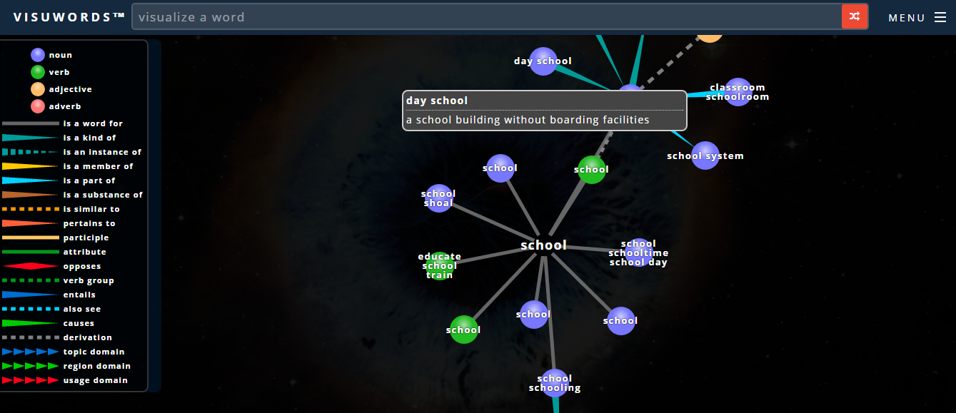 Visuwords utiliza WordNet de la Universidad de Princeton, una base de datos de código abierto construido por los estudiantes universitarios y los investigadores del lenguaje. Combinado con una interfaz de usuario y herramientas de visualización y construido a partir de una combinación de tecnologías web modernas, está disponible como un recurso gratuito para todos los usuarios de la web. No se requiere membresíaPuede ser un buen recurso para la enseñanza de idiomas por su interactividad y su interfaz atractiva.