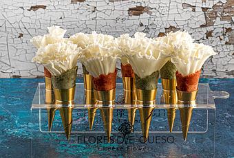 Por último, las Flores de Queso se sirven en cucuruchos de galleta con sabores como; sésamo negro, cacao, fresa, albahaca, remolacha, chili picante, alga nori, pesto, vainilla ó limón, y con distintas emulsiones dulces dentro del cucurucho de membrillo, mango, frutos rojos, dátiles ó pimientos rojos.