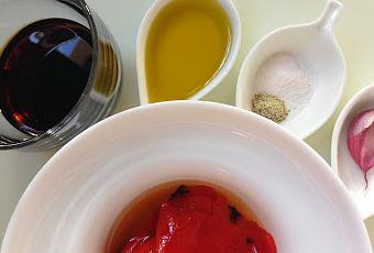 Limpiamos los pimientos de semillitas y restos de piel, reservando el jugo que colaremos y guardaremos en un vasito. En el aceite, a fuego medio, doramos el diente de ajo pelado que retiraremos del recipiente en cuanto empiece a coger color. Incorporamos los pimientos, troceados en cuartos al fuego, donde doramos el ajo y rehogamos durante un minuto. Salpimentamos y cocinamos un minuto más. Añadimos el vino y cocinamos semi-tapado 5 minutos. Retiramos, dejamos templar antes de triturar y pasar por un colador con ayuda de una cucharilla ( para aprovechar bien toda la crema). Reservamos.