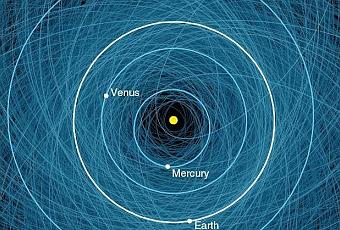 Según los últimos datos de la NASA, esta imagen representa las órbitas de unos 1400 asteroides que son potencialmente peligrosos para la Tierra (los NEAs).