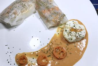 Se hidratan en agua fría las obleas de arroz unos minutos para hacerlas maleables.Se pone una oblea en un plato y se rellenan con las judías. Esta forma de presentarlo es decorativo asi que se puede poner en el fondo algunas flores o rodajas de zanahorias cocidas para dar otro color.