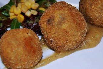INGREDIENTES:2 Patatas pequeñas½ MorcillaUnos piñonesSal y aceite1 manzanaUn trozo de canela en rama Licor de canelaPimienta y canela en polvoHuevoPan ralladoHojas, maíz, pimientos rojos asados, vinagre de Módena… (Decorar)