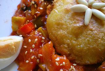 Este plato es otra receta de reminiscencias sefardíes, una gastronomía en la que el repertorio disponible es denso y sumamente delicioso. En esta cocina, precursora junto a la morisca de nuestra cocina actual, solemos encontrar entremezclados, el dulce aroma con el salado bocado y que, casi por arte de magia, nos transportan a otros mundos.Estas sorpresas de patata resultan de lo más deliciosas en todo su conjunto: textura exterior crujiente, un relleno de jugosa carne especiada y asentada sobre un lecho de pisto caramelizado, de verdad, no dejeís de probarlas.