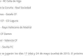 Estos son los emparejamientos resultantes del sorteo de la Copa de Campeones de División de Honor Juvenil: Lunes, 4 de mayo10:00 Real Madrid CF - RC Celta de Vigo12:30 UD Las Palmas - RCD Espanyol17:00 Málaga CF - Rayo Vallecano de Madrid19:30 Villarreal CF - Real SociedadMiércoles, 6 de mayo17:00 Vencedor Real Madrid/RC Celta - Vencedor UD Las Palmas / RCD Espanyol19:30 Vencedor Málaga/ Rayo V.- Vencedor Villarreal/ R. Sociedad