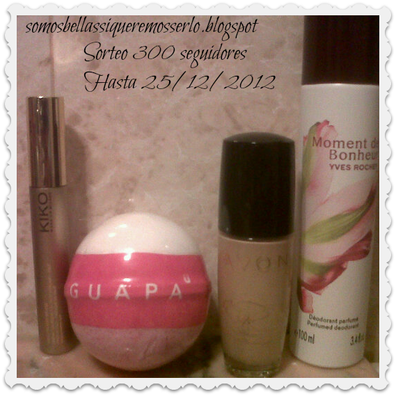 -Máscara de pestañas maxi brush de Kiko-Bola perfumada guapa para el baño-Base de maquillaje 24k Gold Natural-beige 30ml de Avon-Desodorante en Spray perfumado Moment de Bonheur 100ml de Yves RocherNORMAS BÁSICAS PARA PARTICIPAR-Ser seguidor público del blog-Indicar nick de seguidor y correo electrónico de contacto-El sorteo es a nivel nacionalPARTICIPACIONES EXTRAS (+1)-Publicas en tu blog la foto del sorteo bien como entrada o como banner-Si eres top comentarista-Si me sigues en twitter: @yolandaelle-Si publicas sorteo en twitterA continuación os dejo la PLANTILLA-Te sigo como: (NICK)-Contactar conmigo a través de: (e-mail)-Publico sorteo como entrada: (Dejar link blog)-Publico banner en blog: (Indicar sitio y enlace)-Te sigo en twitter: Si/No-Soy top comentarista : Si/No