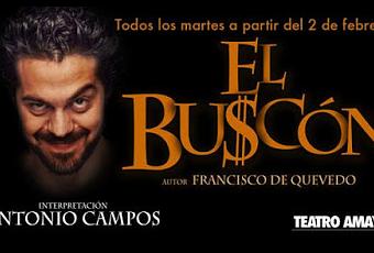 El Buscón, de Quevedo, es una apasionante aventura en nuestra sociedad actual que muestra este país de pícaros con una interesante versión: moderna en sus planteamientos y demoledora en su conclusión. Escrita por Francisco de Quevedo en el Siglo de Oro y adaptada al teatro por Juanma Cifuentes. El Buscón es un personaje que se busca a sí mismo con la redención de un ser que sólo desea salir de la condición que le ha tocado vivir. El espectador podrá perderse en el maravilloso mundo de la imaginación y soñar junto al actor Antonio Campos interpretando a 36 personajes, reírse al contemplar las desgracias a las que se enfrenta el personaje. A la manera que se intentaba hacer reír por aquella época. A la manera de Quevedo.
