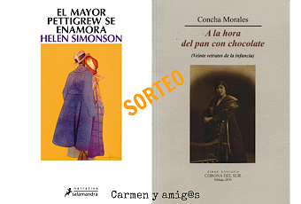 Pues ya veis, otro sorteo más. Esta vez serán dos libros: El mayor Pettigrew se enamora, de Helen Simonson, (RESEÑA AQUÍ) y el poemario A la hora del pan con chocolate, de Concha Morales (RESEÑA AQUÍ). El primero ya lo sorteé en el blog en la Semana British, se le envió a la ganadora a Costa Rica, creo recordar, y lo recibí meses después de vuelta porque en la dirección no se había podido realizar la entrega. El segundo lo sorteé en su momento y se le envió a la ganadora; este es un nuevo ejemplar que gané en un sorteo en el blog El tiempo de Román- gané también un ejemplar de La sombra de las horas, que pronto reseñaré- y, como ya tengo mi ejemplar firmado, pues eso, lo sorteo para que una o uno de vosotr@s pueda también disfrutarlo.