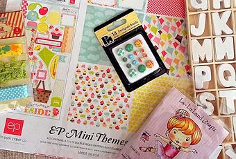 - El kit Let's Picnic de Echo Park Mini Themes que tiene 6 papeles de doble cara de 12"x12" y una hoja de pegatinas de 6"x12"- Pack de tres cintas de Prima de la colección Sun Kiss- Pack de catorce brads decorados de Papermania son 6 de 11mm. y 8 de 7mm.- Sello de caucho (para montar en base acrílica) de La-LaLand Crafts. Es el Marci Bailarina.- Tres hojitas de plástico mágico de 13x10 cms.- Abecedario de madera blanca, seis piezas por letra. De 3 cm.
