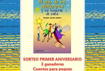 ¡Hola a todos/as!Dentro de muy pocos días Cuentos para peques cumple su primer año en la blogosfera, y gracias a la colaboración de Ediciones Tagus (el nuevo sello editorial de Casa del Libro) os puedo traer un sorteo para celebrarlo. Habrá dos ganadores, y cada uno se llevará el ebook El club de los aventureros y los hombres de plata. Aquí tenéis la valoración que hice de este cuento para que lo conozcáis y sepáis si os interesa. A continuación, os dejo con las bases del sorteo y con los puntos extra que podéis conseguir:BASES:- Habrá dos ganadores que serán elegidos mediante Random.org- Cada ganador se llevará el ebook El club de los aventureros y los hombres de plata de Enrique Gómez Medina.- El sorteo empieza hoy, 1 de Noviembre, y finalizará el 22 de Noviembre a las 23:59.- El sorteo es internacional. - No es obligatorio ser seguidor del blog para participar. Pero si acabas de descubrir Cuentos para peques, te gusta y quieres seguirlo, estaré encantada de recibirte:)- Es obligatorio dejar un comentario en esta entrada indicando claramente que participas. - Por participar consigues 1 punto. - Si eres seguidor antiguo (antes de la publicación de esta entrada, es decir, hasta Rosa Luque) te lo agradeceré con 2 puntos extra. PUNTOS EXTRA (son opcionales):+3 puntos: Si el día que termina el sorteo te encuentras en el Top comentaristas del blog (mirar barra lateral derecha).+3 puntos: Por publicar una entrada en tu blog anunciando el sorteo con un enlace a esta entrada (Puede ser única o compartida). +3 puntos: Por colocar el banner del sorteo enlazado a esta entrada en tu blog. +3 puntos: Por anunciar el sorteo en una red social (Twitter o Facebook) con un enlace a esta entrada. No tienes que anunciar el sorteo en ambas redes sociales, solamente en una de ellas. Todos los participantes tendrán que mandar un correo a [email protected] con el asunto "Sorteo primer aniversario". Este correo tendrá que incluir los siguientes datos:- Tu nick (si tienes blog) o tu nombre.- Enlace a la entrada de tu blog donde anuncias el sorteo.- Enlace a tu blog (si has colocado el banner). - Enlace del anuncio del sorteo en una red social (Twitter o Facebook).¡Espero que os animéis a participar!Banner del sorteo: