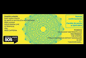 Los nuevos artistas confirmados se suman a Damon Albarn, East India Youth, Él Mató a un Policía Motorizado, Erol Alkan, Gold Panda Live, Is Tropical, Izal, Miss Caffeina, Phoenix, The Bloody Beetroots Live, The Prodigy, The Strypes, Totally Enormous Extinct Dinosaurs... Toda la info y las entradas las tienes en www.sos48.com.