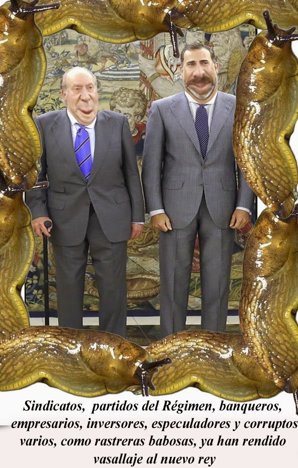 Ya han acudido todos, los representantes de los sindicatos, los partidos del Régimen, incluidos algunos que dicen ser de izquierdas y no lo son, banqueros, empresarios, inversores, especuladores y corruptos de diverso pelaje y cuentas en paraísos fiscales, como rastreras babosas, ya han rendido vasallaje al nuevo rey que del mismo modo que el anterior impuso un criminal este lo intentaran imponer ellos. ¡Referedum Ya! (Paco Arenas)
