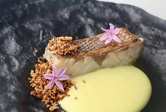 También entre sus nuevas creaciones se encuentra el ‘Figatell de pato, codium y halófilas’, que, con una presentación en llamativos tonos verdes, remite a un plato con ADN valenciano y evocadores recuerdos a mar que nacen de las hierbas marinas. La gran Lubina Atlántica de Aquanaria se disfruta en el plato ‘Lubina ahumada, almendras, azafrán y farofa de chirivía’, una llamativa combinación de texturas que acompañan a la delicada carne de este apreciado pescado.