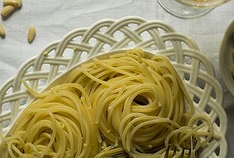 - Preparamos los spaghetti según instrucciones del fabricante. Una vez listos, los escurrimos y añadimos a la cacerola con las alcachofas. Removemos bien y servimos. Para servir, picamos por encima los piñones que nos queden, los pistachos y añadimos un poco de ralladura de limón.
