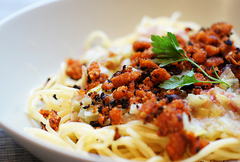 Añadimos los puerros en la cacerola de los spaghetti y removemos. Servimos en los platos y agregamos por encima el pangrattato.