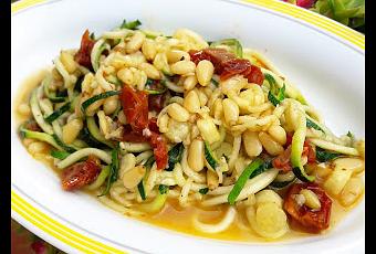 Ingredientes(para 4 personas)2 calabacines grandes2 ajosUn puñado de piñones150 gr. de tomates secos en aceitePimienta de cayenaAceite y SalQueso parmesano (opcional)Primero haremos nuestros spaghetti con la ayuda de una mandolina o rallador. Yo he utilizado un aparatejo muy apañado que hace que salgan largos y estupendos. Lo compré en Casa Viva y es de la marca Oxo, pero podéis encontrar diferentes modelos que harán la misma función por un precio módico (sobre los 15-20 euros).Una vez hechos nuestros spaghetti, los reservamos.