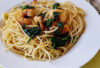 Ingredientes para dos personas:- 200 gramos de spaghettis- Gambas o langostinos (esto al gusto).- Espinacas frescas.- 1 diente de ajo.- 1 cucharada de zumo de limón.- Sal.- Pimienta.