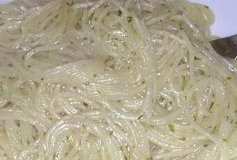 7.- Mezclamos bien los spaguettis con el aliño de limón, a la vez ira tomando sabor del ajo que refregamos en el bol.