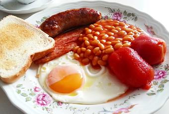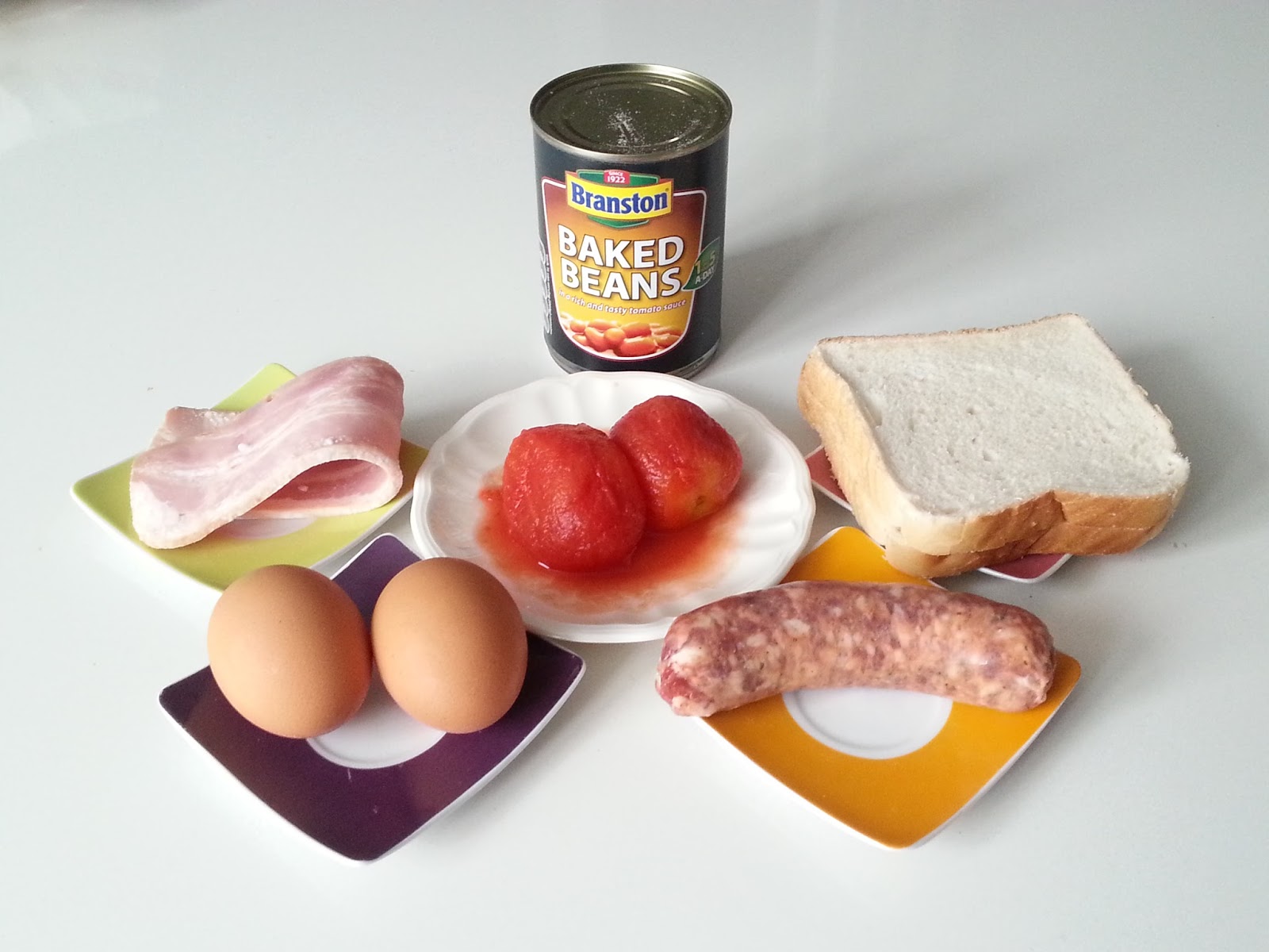 1 o 2 salchichas caserasBaked Beans( las podéis encontrar en los supermercados)Bacon cortado más grueso de lo normal2 tomates pelados y escalfadosUna rebanada de pan1. - Lo primero que haremos será poner en una sartén a fuego medio la salchicha y el bacon, para que se vayan haciendo despacio, unos 5 o 10 minutos.