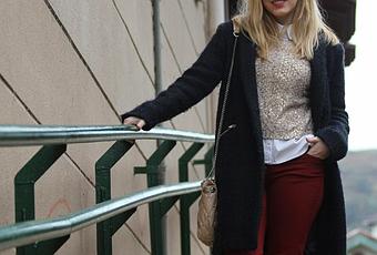 Mientras tanto, vamos con el look de hoy. Se que puede parecer raro verme con pantalones de color, pero el otro día recordé estos jeans granates y no he podido evitar usarlos: ¡llevaba sin ponérmelos desde el invierno pasado! Por suerte, a veces salgo de los vaqueros. Lo combiné con un jersey color dorado para darle un toque especial, un buen abrigo para el frío y botines a juego con el jersey ¿Os gusta la combinación?