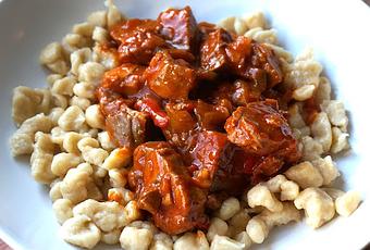 Unos deliciosos spaetzles con un buen guiso de carne, constituye un plato único en la zona sur de Alemania. En mi caso los hice con goulash con páprika húngara.