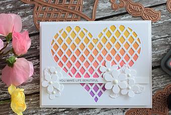Para hacer esta tarjeta simplemente he usado tres colores de tintas Distress Oxide en un panel de cartulina, después he troquelado el corazón de rejilla en una cartulina blanca y unas cuantas flores y hojas para colocar alrededor del sentimiento. Unos cuantos.... en el centro de las flores ¡y listo!