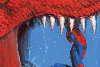Acongojante portada de Gabriele Dell'Otto para el número 14 de la colección Avenging Spider-Man de Marvel. ¿Os acordáis de la ilustración de Lobezno contra el T-Rex?