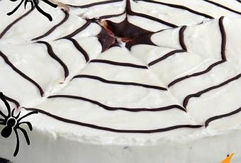 - Decoración: Deshacer en el microondas chocolate negro para obtener 4 cuch. de chocolate derretido y mezclar con 1 cuch. de nata líquida. Poner en una manga pastelera pequeña. Sin que llegue a enfriarse, hacer un círculo con la manga de 1 cm. en el centro de la tarta, y formar círculos concéntricos alrededor del mismo con el chocolate. Con la punta de un cuchillo (hundiéndolo ligeramente), hacer líneas desde el círculo central hasta los extremos, limpiándolo cada vez, para formar la tela de araña. Dejar en la nevera mínimo 1 hora, desmoldar con cuidado, decorar con arañas dulces y servir.