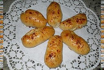 3-CORTAR 24 PORCIONES DE UNSO 40 GR. CADA UNA, APLANAR CON EL RODILLO, ENVOLVER MEDIA SALCHICHA EN MEDIA LONCHA DE QUESO, Y DESPUÉS FORMAR UN BOLLITO, CERRANDO BIEN LOS BORDES, PONER EN UNA BANDEJA, TAPAR Y LEVAR DE NUEVO,