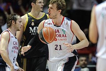 Un dos más uno de Teletovic aumentó la diferencia (20-14 a los 7m 58s) y Llull (11 puntos), recuperado de la lesión, reapreció con una entrada llena de agresividad, talento y fe. Su enumeración de valores. Perseveró el Caja Laboral en su propuesta sencilla y pasional. La confianza genera confianza y Eliyahu, básico en el Maccabi y residual con Ivanovic, en parte por las lesiones, tuvo un estreno explosivo en el partido con cuatro puntos (uno menos que su media en los pocos partidos que ha disputado) y encontró en Ribas a su mejor socio (31-20 a los 12m 12s). Se recompuso el Madrid con un parcial de 0-7 y Vidal aportando cinco puntos seguidos (31-26 a los 15, 47s). Sexto jugador en Vitoria, Vidal se ha pasado casi todo el año en el banquillo, pues Messina le considera una de sus últimas opciones en los relevos. Un nuevo caso más de jugador desaprovechado. Los visitantes tampoco acabaron de sacar provecho de la confusión del Caja Laboral hasta el descanso y no consiguieron ponerse por delante, si acaso recortar la ventaja a un mínimo de tres puntos (34-31 a los 19m 41s; 36-31 al descanso) y a dos en el inicio del tercer cuarto (36-34). Los puntos Teletovic y Splitter sostuvieron al Caja Laboral hasta la eclosión de Velickovic con cinco puntos seguidos y dos triples de Llull y Lavrinovic (13). Incluso surgió Prigioni para cerrar el cuarto con un triple casi al límite (51-55).
