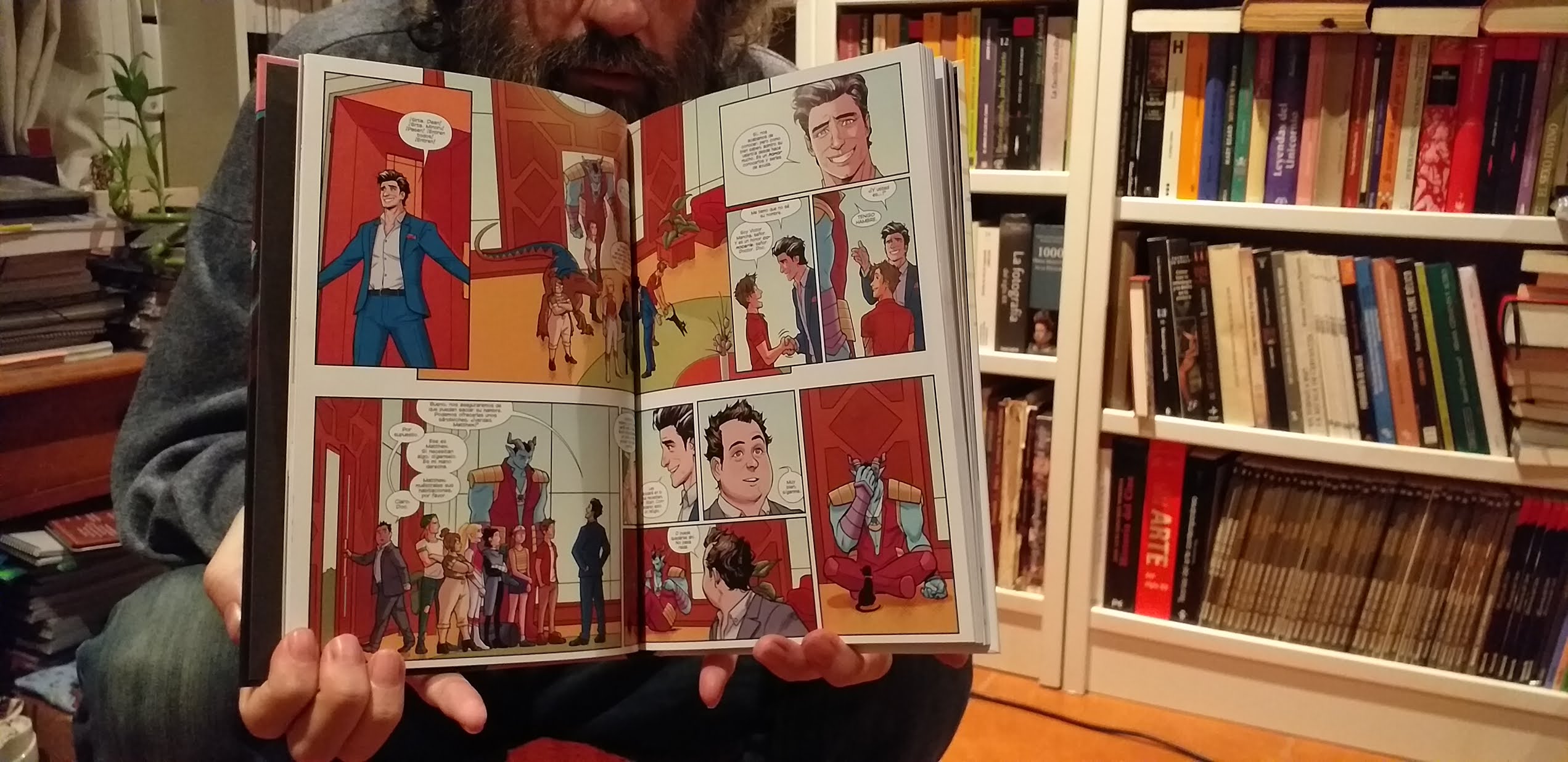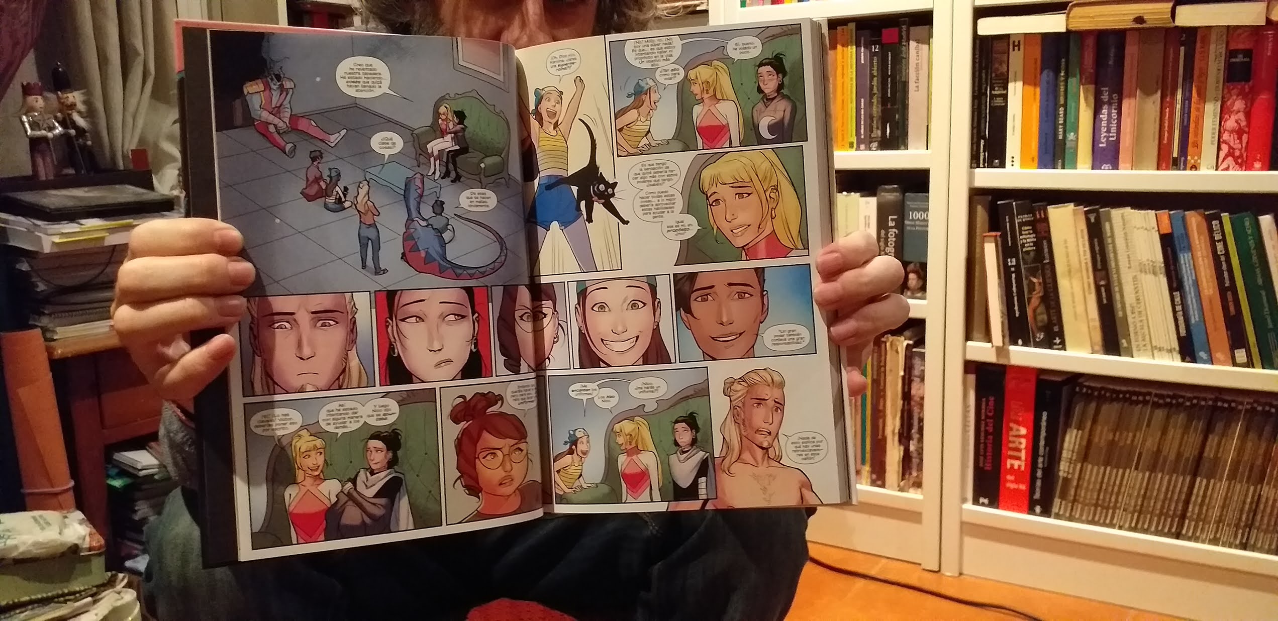 Pensaba recortar las fotos pero luego se me ha ocurrido quera procedente un ejercicio de transparencia así que ahí van algunas pistas sobre el tipo al que soléis leer.Qué vergüenza mira que hay cómics en mi casa y no ha salido ninguno más en la foto. Me vais a tomar por un bocazas. :SEl hecho de que muestro una parte diferente de mi rostro en cada foto ha sido puro azar. Qué gracia. Y la composición descentrada pero equilibrada mola.Evidentemente he puesto lo peor para darme toda la razón posible. Hay más páginas donde el dibujante ha usado viñetas que cubren ambas páginas que la mala edición de Panini impide al lector disfrutar y al autor presentarle su trabajo tal y como lo concibió, pero el resultado no es tan terrible o es gracioso (2 personajes enfrentados a los que la imposibilidad de los 180º acerca, quizás debí mandar hacer foto...). Y no voy mencionar ;P que algunos bocadillos están demasiado próximos a la falla central (tiene nombre técnico eso???) de tal modo que no es cómodo leerlos. En fin, que esto qué es??? Pero no es el tomo de tapa dura la mejor edición posible???Entiendo que aquí hay un problema editorial. Evidentemente el editor desto le tenía que decir al dibujante desto que nada de viñetas que cubran ambas páginas. De la guionista desto dicen que hace graphic novels, acaso eso no se lo dicen al artista desto? Sr dibujante questo se publica en todo tipo de tomos así que lo que hace termina por no quedar bien. Será que trabaja en una pantalla apaisada en vez de en un papel vertical? Tiene gracia que el dibujante apueste por la grapa pero el mercado por el tomo. Pero es triste que aquel sea una democracia de ciegos... Mas obviemos que hay un problema. Uno que ninguna parte quiere evitar. Con esto es con lo que ha de lidiar Panini y ntros vivir. La manera en que la editorial europea lo hace es la mejor?Veamos. El tomo de Runaways es caro... bueno; ahora con el subidón grapil es barato. Es caro porque nadie lo compra, suerte que sedita. Y para enjuagarlo la editorial, como es típico en España, le da al comprador lujo innecesario: tapa dura y gruesa, papel cartulina y una encuadernación cosida (y un par de microtextos bobalicones, Fonseca tiene sucesor!, para que parezca que es obra humana). Esto es una tontería (ver siguiente párrafo) pero en este caso además un gran error. La encuadernación no se ha escogido bien ya que el lomo es tan rígido y las cubiertas tan gruesas que impiden abrir el cómic bien, o sea, 180º, lo cual amigos digitales es posible, pese a que es de pocas páginas. Tengo libros y cómics (seguramente alguno de Panini incluso) que lo prueban. Esto es viejo porque ya hace tiempo que el mundo editorial resolvió como permitir leer bien libros gruesos (cómo son los antiguos??) y/o evitar que el lomo se estropee por estar el libro muy abierto durante mucho tiempo (quién no ha visto un libro con una grieta que cubre toda la vertical de un lomo). Por tanto aquí Panini la ha cagado.Me parece indignante, aunque cuando cierro el tomo me calmo. Pero el 5º ha colmado mi paciencia. Mucho amor a los cómics, mucho respeto al cliente y tal, PERO no. Cierto que una golondrina no hace verano pero a estas alturas deberían estar extintas. Somos humanos o qué? :) Pero lo peor no me parece que el formato sea una cagada. La típica hecha sin pensar porque en Panini saben de sobra que los dibujantes no piensan en el tomo, y desde que lo audiovisual lo está petando; menos. O es que en Panini nadie lee cómics Marvel? Lo peor es que un cómic juvenil totalmente alejado del Universo Marvel, con apenas Continuidad y con serie de tv venga en una edición para fetichistas. Si un chaval quisiese probar el papel motivado por todo lo anterior, esta edición, por su precio y aparato, le impediría pasar por caja. Además, algo marginal como esto merece una edición para obras maestras? Si es que es absurdo. El formato es incongruente con el material y con el target del mismo (creo). Aleja a quien va dirigida la obra y apela a quien pasa della. Ahora, no sé si mejor esto que el formato juvenil que sacaba de inventar Panini. Creo que la reducción es lo que más me repatea. En fin, está claro, dado la cantidad de formatos de cómics que hay hoy, que las editoriales españolas de comic books saben que su clientela es diversa (en el sentido propio de la palabra, no en el que los subnormales quieren darle) como lo son sus canales de venta, pero también está claro que hace falta inventar más o afinar la puntería. Décadas haciendo caso a los fetichistas y a los que piensan que un cómic es una lectura daeropuerto ha producido que haya muchas ediciones equivocadas. Marvel es algo popular, juvenil y sencillo. Es decir, incompatible con los lujos y las rigideces. Y es cómic, no libro.Bueno, esto en realidad era porque no sabía qué escribir para este 5º tomo de Runaways ya que cada uno es tan similar al anterior que es imposible no repetirse habiendo hablado ya de 4. Nobstante este me ha parecido el peor: demasiadas páginas para tan poco argumento y la serie se atasca, siguevitando el Universo Marvel (cosa que facilita las reediciones pero impide que la cole sea duradera, Spiderman sigue publicándose porque su prota no vive aislado) y sigue teniendo alergia a lo superheroico. Está muy bien escrita, tiene grandes personajes y es bastante graciosa PERO está mal enfocada. Sus protas no huyen, sesconden. Eso contradice el título, no mola y es antiMarvel ya que no es dinámico. No se puede hacer una historia de zombis donde no sale ninguno y el grupo protagonista no sale nunca del sótano. Joder, sra Rainbow Rowell, que tiene nombre de identidad secreta de superhéroe clásico, métele caña! Salgan usted y los runaways de su zona de confort. Haga el cómic del Hulk clásico del siglo XXI. O algo.