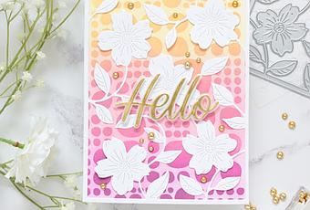 Ahora hablemos de la tarjeta. Como podeis ver, he usado tres productos chulísimos de la nueva colección: "Flourishing Bloom Plate", "Dots on Dots stencil" y "Handwritten Hello".He comenzado creando el fondo con el sténcil y tres colores de tintas Distress Oxide ( Seedless Preserves, Victorian Velvet y Scattered Straw). Primero he saturado bien los colores para tener una buena definición de los lunares, después he retirado el sténcil y he vuelto a aplicar los mismos colores de tinta de una forma mucho más suave.
